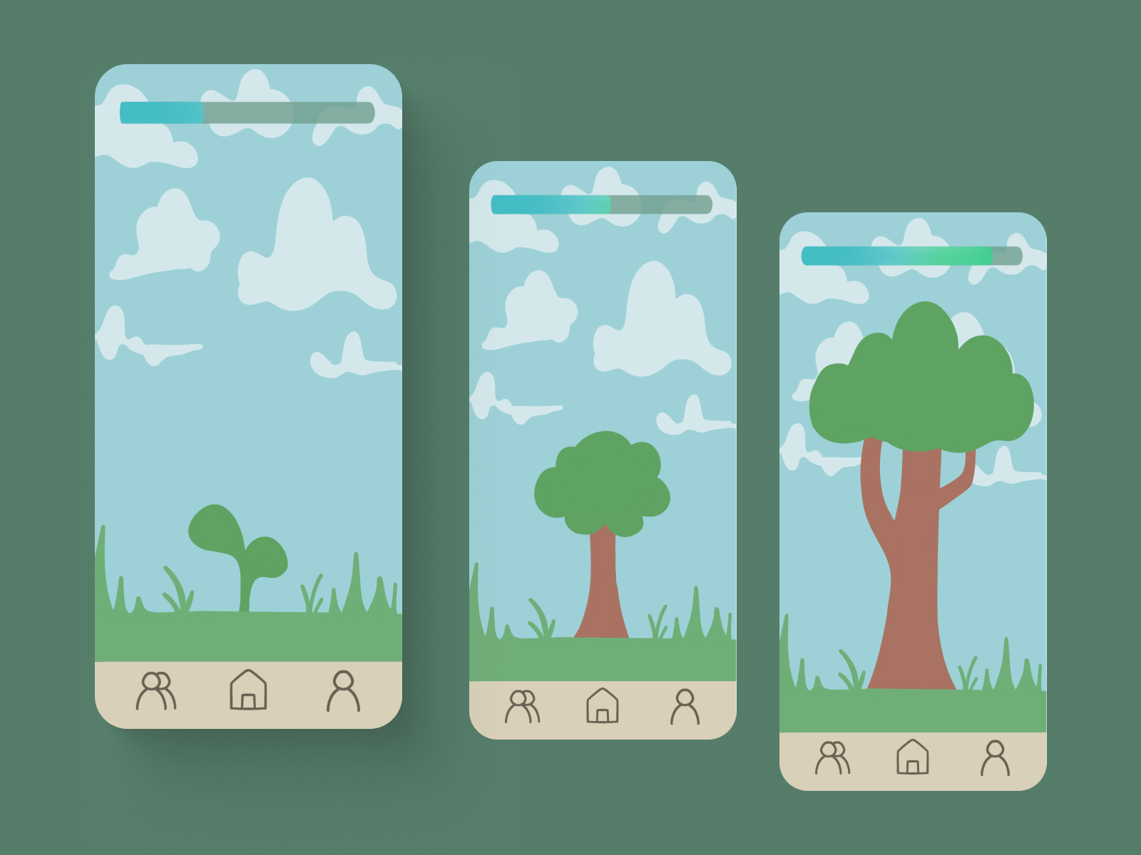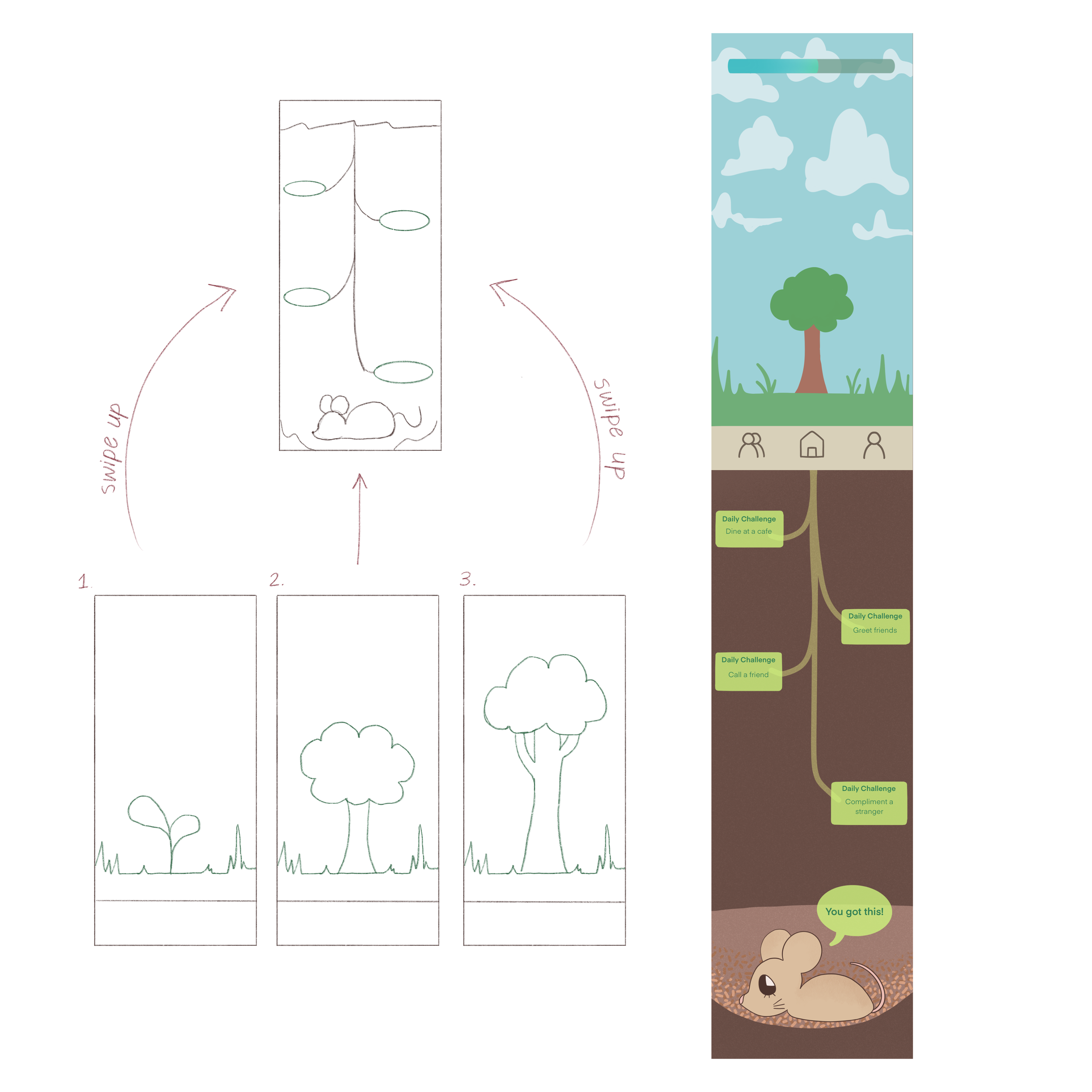 Sketches were made in the process of conceptualizing the user interface of branchOUT. We wanted to consolidate both the essential ideas of goal completion and progress visualization. Our solution was to combine both main visual elements into the same screen with user navigation mechanics: the user views different goals to be completed by scrolling down from the main screen.